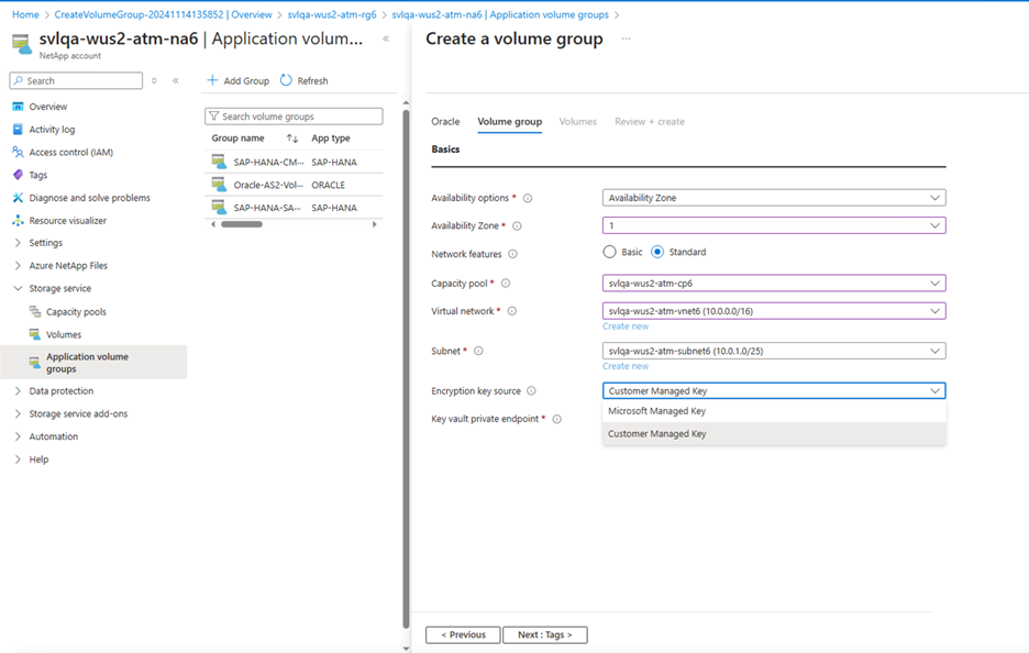 Specify the delegated subnet where the IP addresses for the NFS exports will be created. Ensure you have a delegated subnet with enough free IP addresses. - Encryption key source: Select Customer Managed Key or Microsoft Managed Key. If you choose Customer Managed Key, provide the key vault private endpoint.