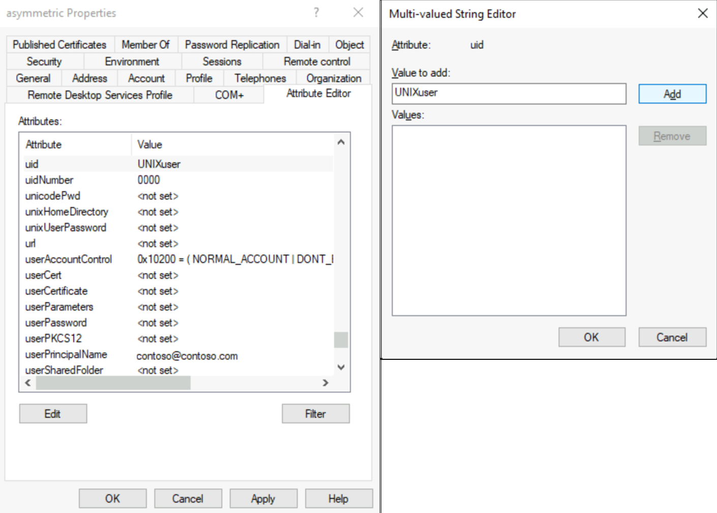 In the following example, a user has a Windows name of asymmetric and needs to map to a UNIX identity of UNIXuser. To achieve that in Azure NetApp Files, open an instance of the Active Directory Users and Computers MMC. Then, find the desired user and open the properties box. (Doing so requires enabling the Attribute Editor). Navigate to the Attribute Editor tab and find the UID field, then populate the UID field with the desired UNIX user name UNIXuser and click Add and OK to confirm.
