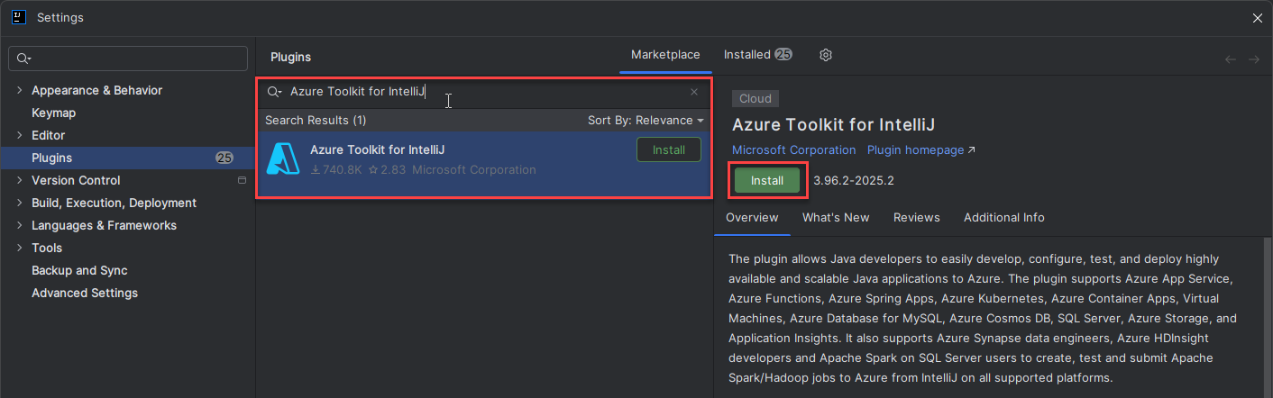 In the Plugins panel of the Settings dialog, search for Azure ToolKit for IntelliJ.