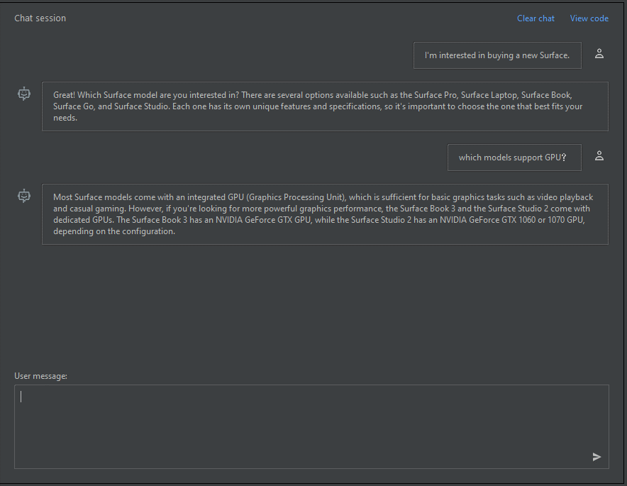 In the chat session pane, you can start with a simple prompt like this one: "I'm interested in buying a new Surface." After you type the prompt, select Send. You receive a response similar to the following example:
