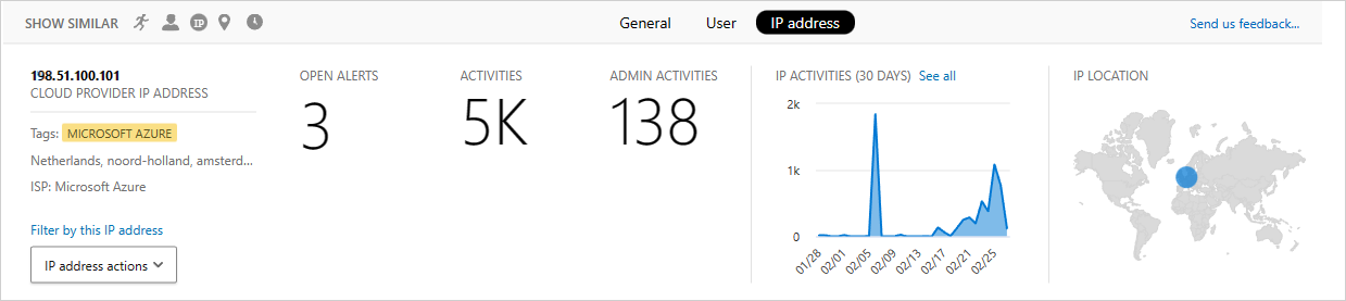 Admin activities: The number of administrative activities performed from this IP address in the past 30 days. You can perform the following IP address actions: