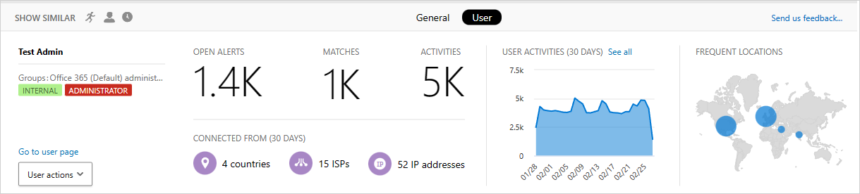 Selecting it opens the Activity drawer User tab provides the following insights about the user:- Open alerts: The number of open alerts that involve the user.