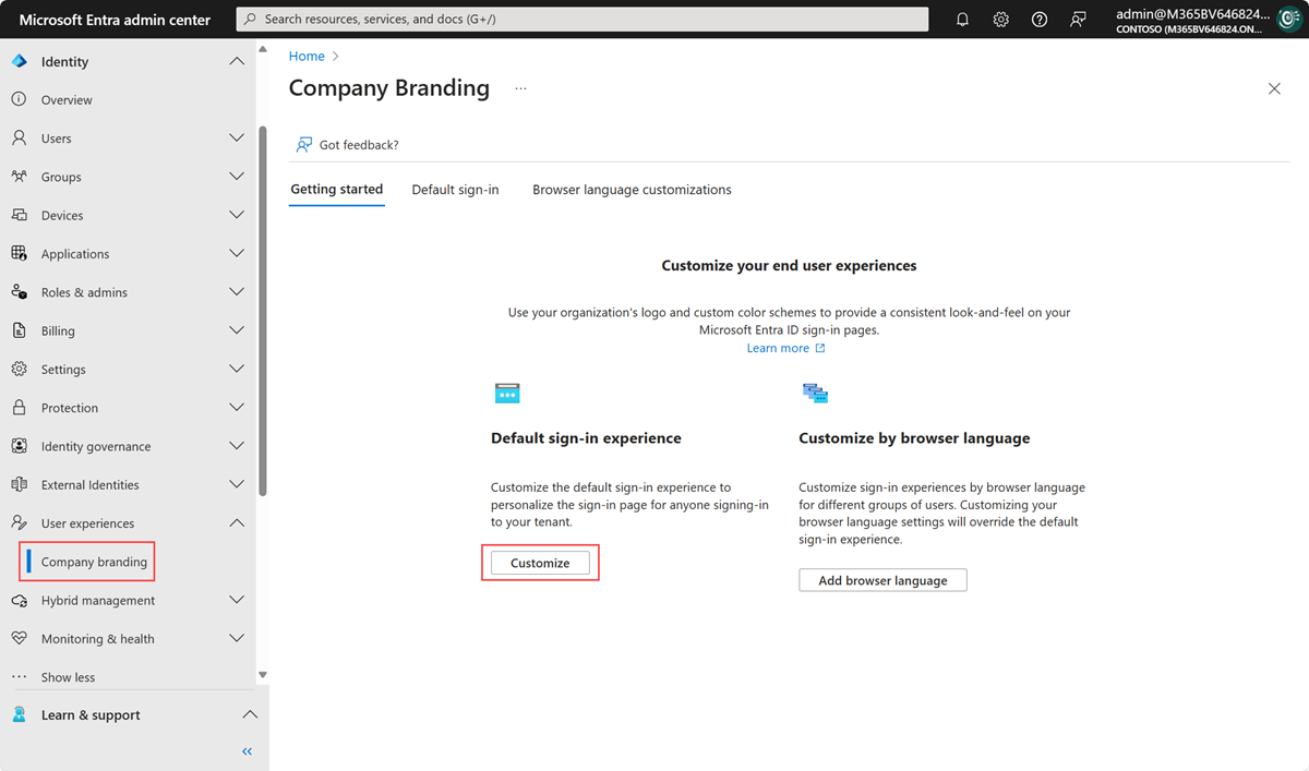 The default sign-in experience is the global look and feel that applies across all sign-ins to your tenant. Before you customize any settings, the default Microsoft branding appears in your sign-in pages. You can customize this default experience with a custom background image or color, favicon, layout, header, and footer. You can also upload a custom CSS file.