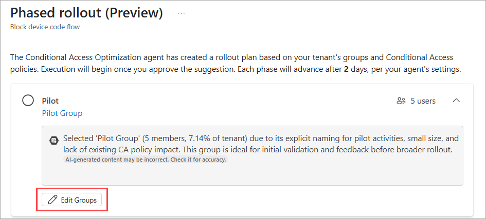 The Conditional Access optimization agent for Microsoft Entra includes a phased rollout capability that helps organizations deploy new Conditional Access policies safely and efficiently. This Microsoft Security Copilot feature in Microsoft Entra enables administrators to introduce policies gradually, monitor their impact, and minimize disruptions. This phased rollout capability provides gradual deployment of new policies to minimize the chance of widespread disruption to end users and reduce the need for manual analysis and planning, saving weeks of effort. As with all aspects of the Conditional Access Optimization Agent, administrators retain full control of the policy changes, such as group selection and rollout pacing. Clear reasoning for the rollout plan is also provided to maintain transparency.
