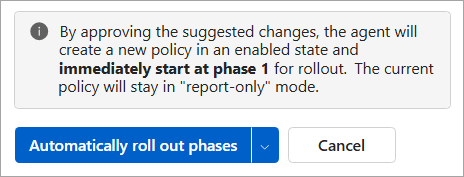 When the Conditional Access optimization agent creates a new policy in report-only mode, it can suggest turning on the policy with a phased rollout. The agent analyzes sign-in data and existing policies to define a phased rollout plan.