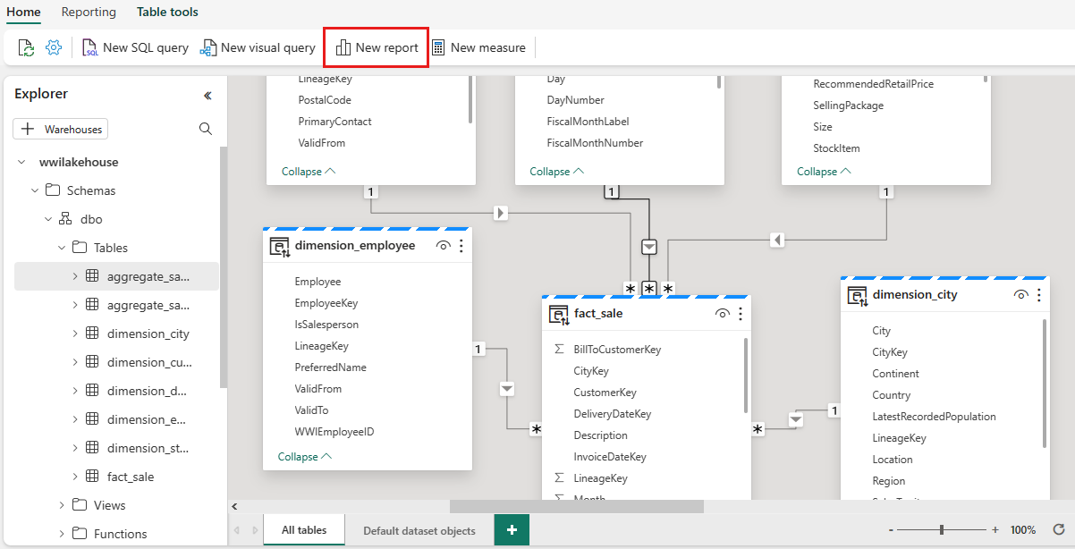 Drag from fact_sale To table To column StockItemKey dimension_stock_item StockItemKey SalespersonKey dimension_employee EmployeeKey CustomerKey dimension_customer CustomerKey InvoiceDateKey dimension_date Date After you add these relationships, your data model is ready for reporting as shown in the following image: