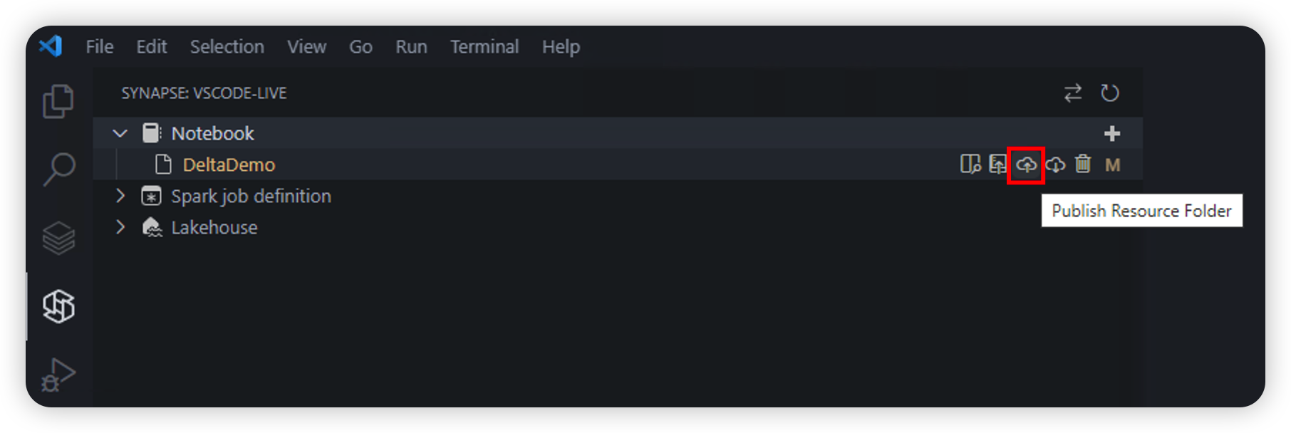 After you edit the notebook file and the resource files, you can upload the notebook resource to the remote workspace by selecting the Publish Resource Folder option. The upload process uploads all the files and subfolders under the builtin folder to the notebook resource. The upload process overwrites the version of the resource files in the remote workspace, including deleting the resource files that you deleted locally.