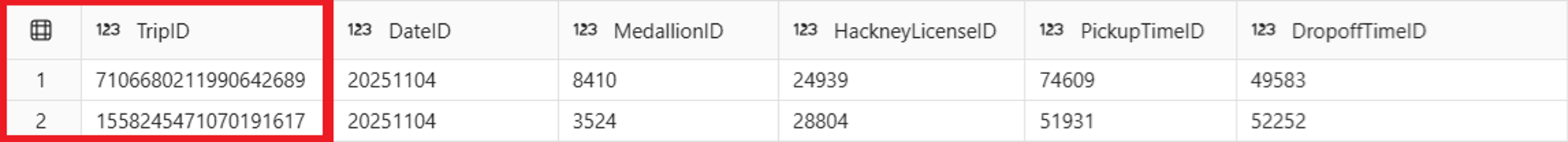 INSERT INTO, but it isn't required. When providing a column list, specify the name of all columns that you're providing input data for, except for theIDENTITYcolumn:INSERT INTO dbo.Trip (DateID, MedallionID, HackneyLicenseID, PickupTimeID, DropoffTimeID) VALUES (20251104, 8410, 24939, 74609, 49583);We can review the rows inserted with a simple query:
