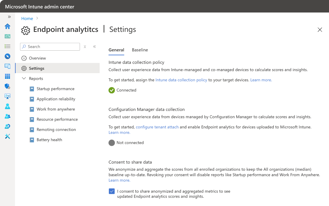 When you open Endpoint analytics for the first time, a guided setup helps you configure data collection. As part of this process, Intune creates a Windows health monitoring policy to enable data collection.