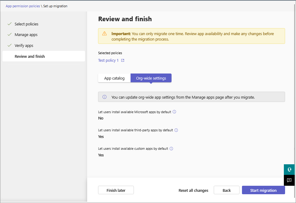 Verify the app availability for the users on the next page. In the following three tabs, it shows a list of apps from your Org-wide app settings and the app permission policies that you choose to migrate.