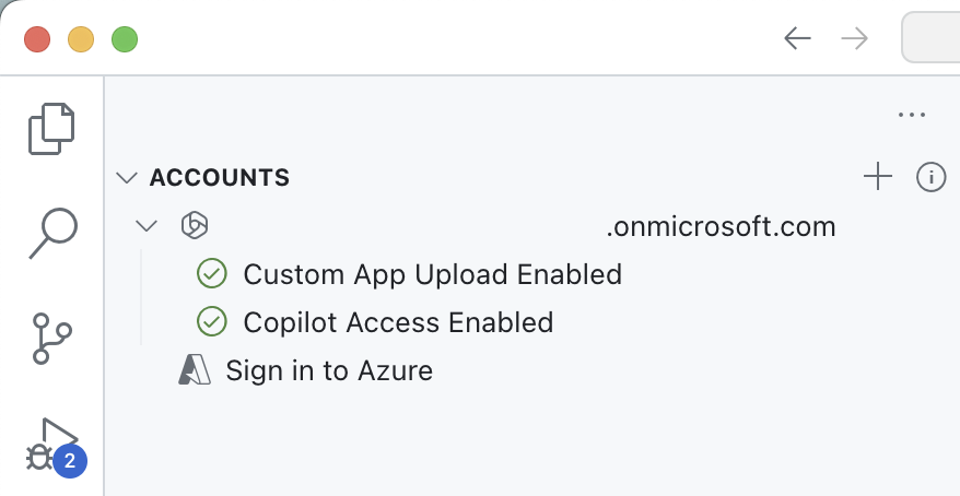 In the Microsoft 365 Agents Toolkit extension panel, in the Accounts section, be sure you're signed in to your Microsoft 365 tenant with Copilot enabled.