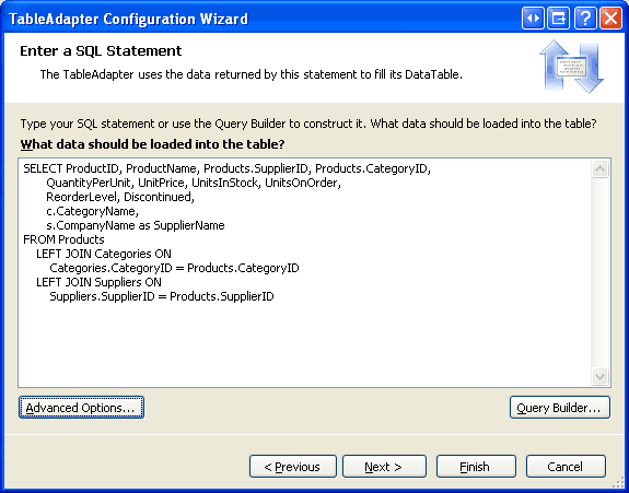 Since this query does not include any JOIN s, the TableAdapter wizard will automatically create stored procedures with corresponding INSERT, UPDATE, and DELETE statements, as well as a stored procedure for executing the main query.