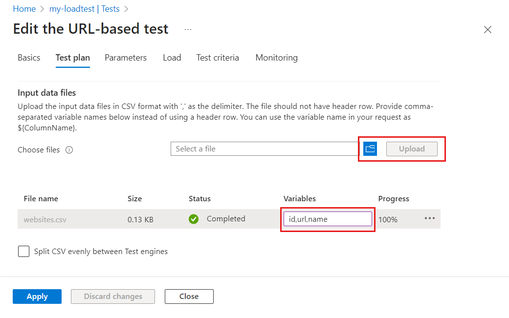 On the Test plan tab, select the CSV file from your computer, and then select Upload to upload the file to Azure.