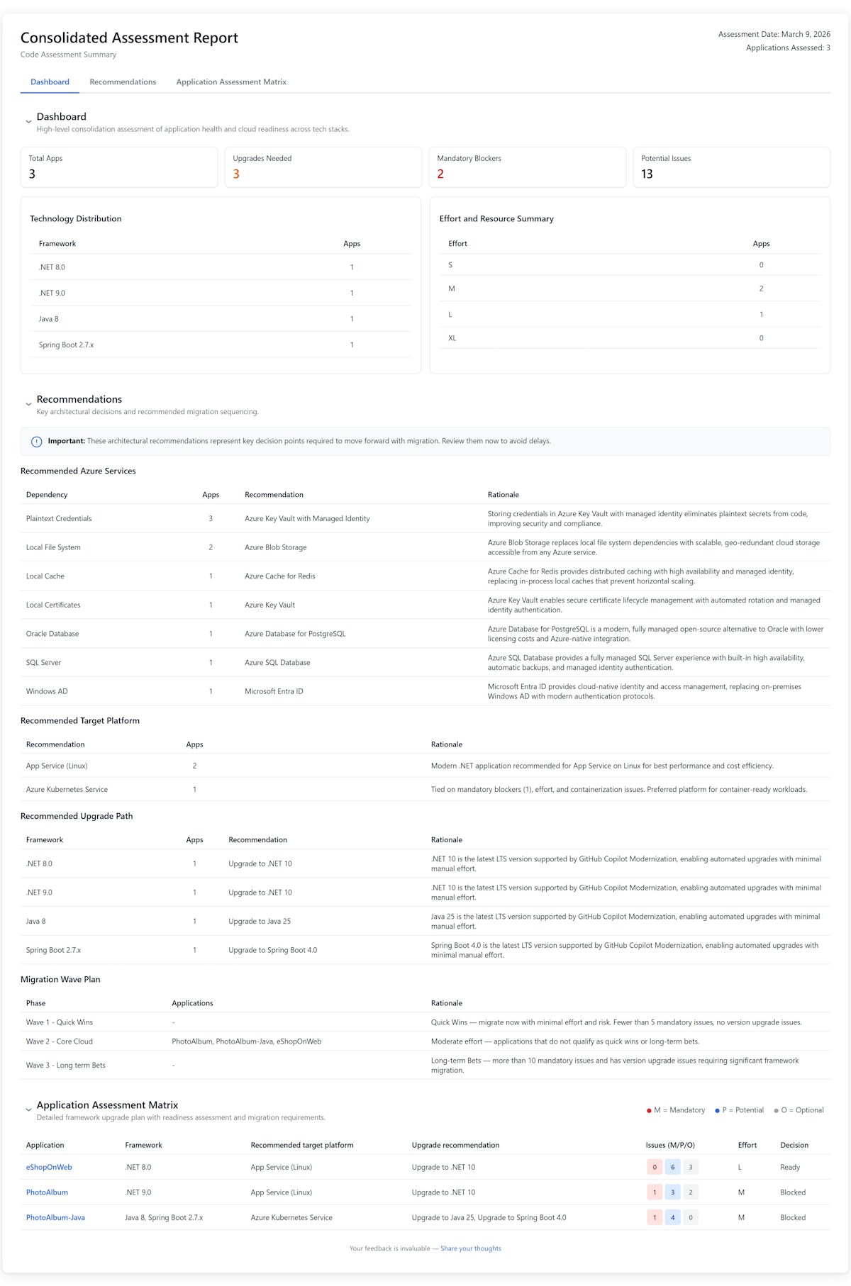 We value your input! If you have any feedback about batch assessment or the Modernization agent, create an issue at the github-copilot-appmod repository or use the GitHub Copilot modernization feedback form.