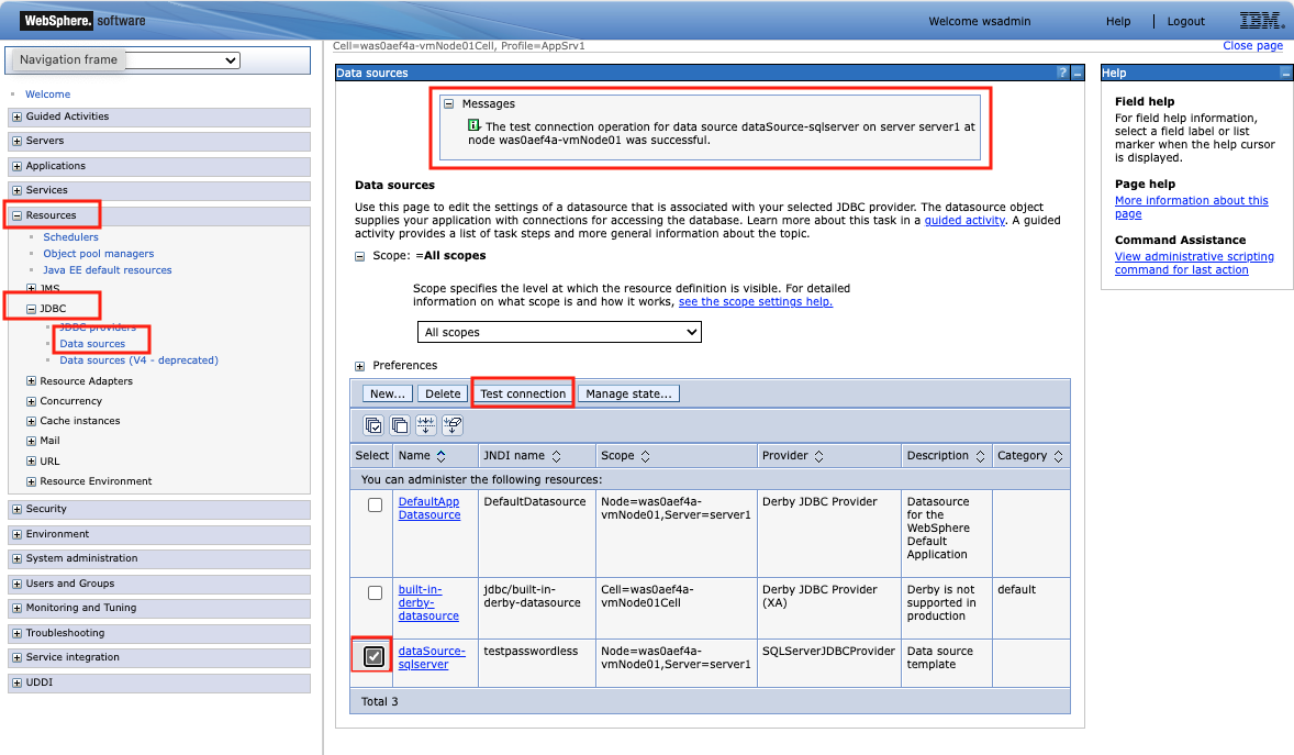 The test connection operation for data source dataSource-sqlserver on server server1 at node was0aef4a-vmNode01 was successful.