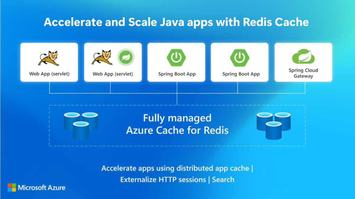 As the workloads for your Java applications grow, you can increase performance by using Azure Cache for Redis to implement an in-memory caching layer for query results, session states, and static content. It's a great way to improve application throughput and reduce latency without having to rearchitect your underlying database. Azure Cache for Redis Enterprise tiers, developed in partnership with Redis and fully managed by Microsoft, is the most highly available and scalable deployment option for running Redis on Azure - including features such as active geo-replication, externalized session management, and high-speed search and indexing.