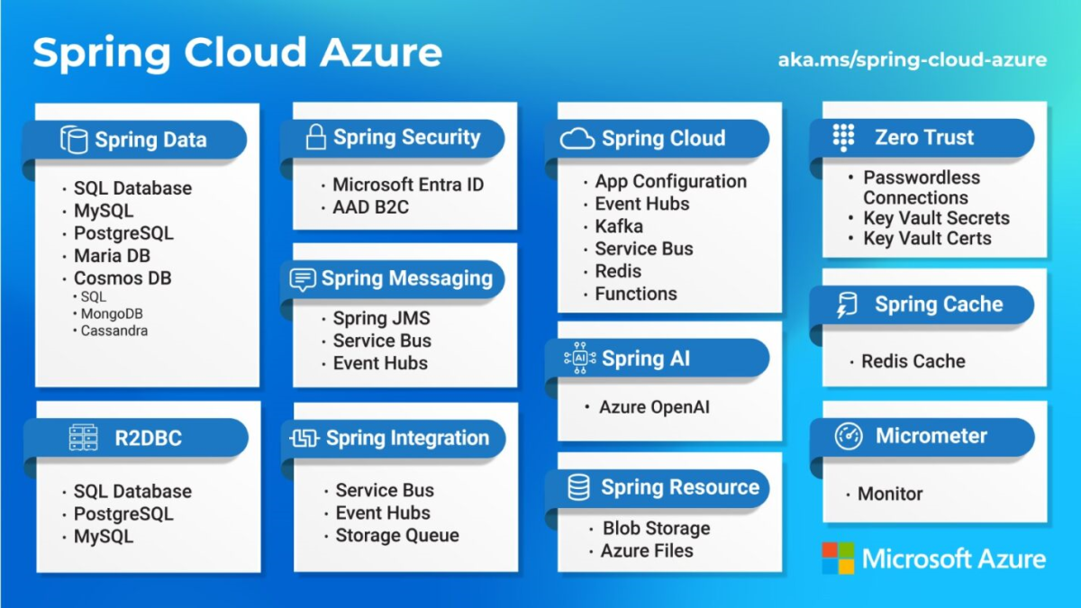 Azure Service Bus Premium tier supports JMS, the Java Messaging Service programming model. Regardless of whether your applications are running on VMs, in Kubernetes, or on fully managed PaaS services, you can quickly provision and use these fully managed data and messaging services using open-source clients, Azure Java SDKs, Spring starters, and application server integrations. They all provide the compliance, availability, and reliability guarantees that you would expect from Microsoft and Azure. Many Java and Spring developers want to use idiomatic libraries to simplify connections to their preferred cloud services. Microsoft maintains a comprehensive list of libraries, drivers, and modules that let you easily interact with Azure services across data, messaging, cache, storage, eventing, directory, and secrets management. For more information, see the Spring Cloud Azure developer guide.