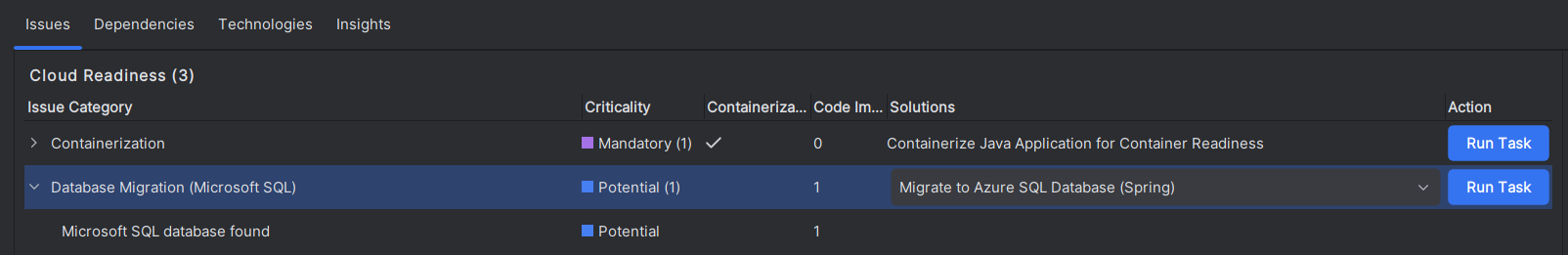 When reviewing the summary report, you can select Migrate to Azure SQL Database (Spring) from the solution list under the issue Database Migration (Microsoft SQL). Then, select Run Task to move to the code remediation stage.