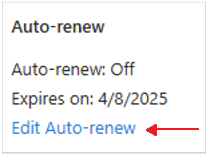 To turn on auto renew, in the side panel that appears, flip the toggle button to On, and then select Update. Now you can see that auto renew is turned on and the date the subscription renews.