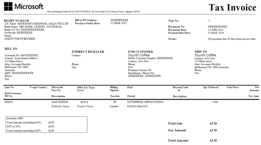 Example 2: an Enterprise Agreement (EA) invoice for Australia, a Microsoft managed country/region (since June 1, 2023) for Microsoft Marketplace purchases.*