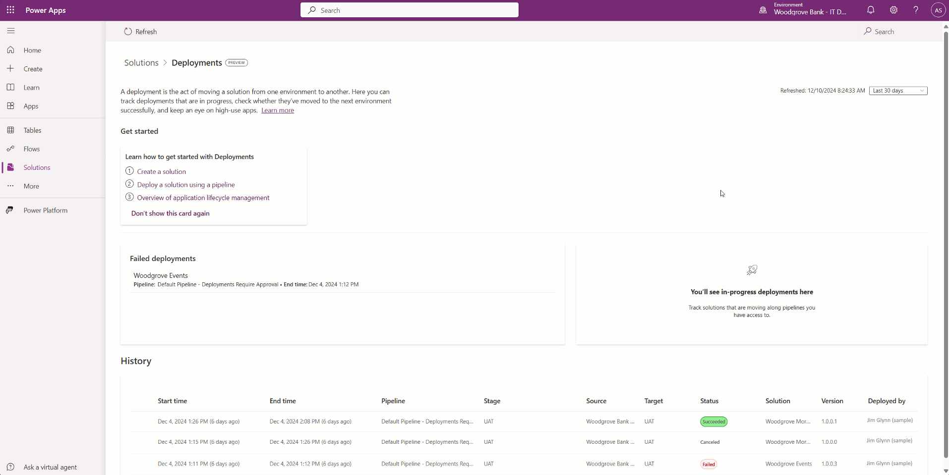 Na dnu pregleda autori pregledavaju svoju povijest implementacije. Ovaj odjeljak sadrži sveobuhvatan popis svih implementacija, uključujući status implementacije, rješenje, kanal i okruženje. Proizvođači mogu filtrirati ovaj popis prema rješenju, kanalu i okruženju kako bi brzo pronašli implementaciju koju traže. Ovaj prikaz povijesti izvođenja jedinstven je. Prvo se filtrira tako da prikazuje samo implementacije trenutnog korisnika posebno u i iz ovog okruženja, a drugo se nadograđuje kako bi se prikazale sve implementacije trenutnog korisnika, a ne samo jedno rješenje ili cjevovod. Odabirom implementacije u ovoj rešetki prikazuje se ploča s pojedinostima koja sažima sve informacije o implementaciji i prikazuje i bilješke o implementaciji.