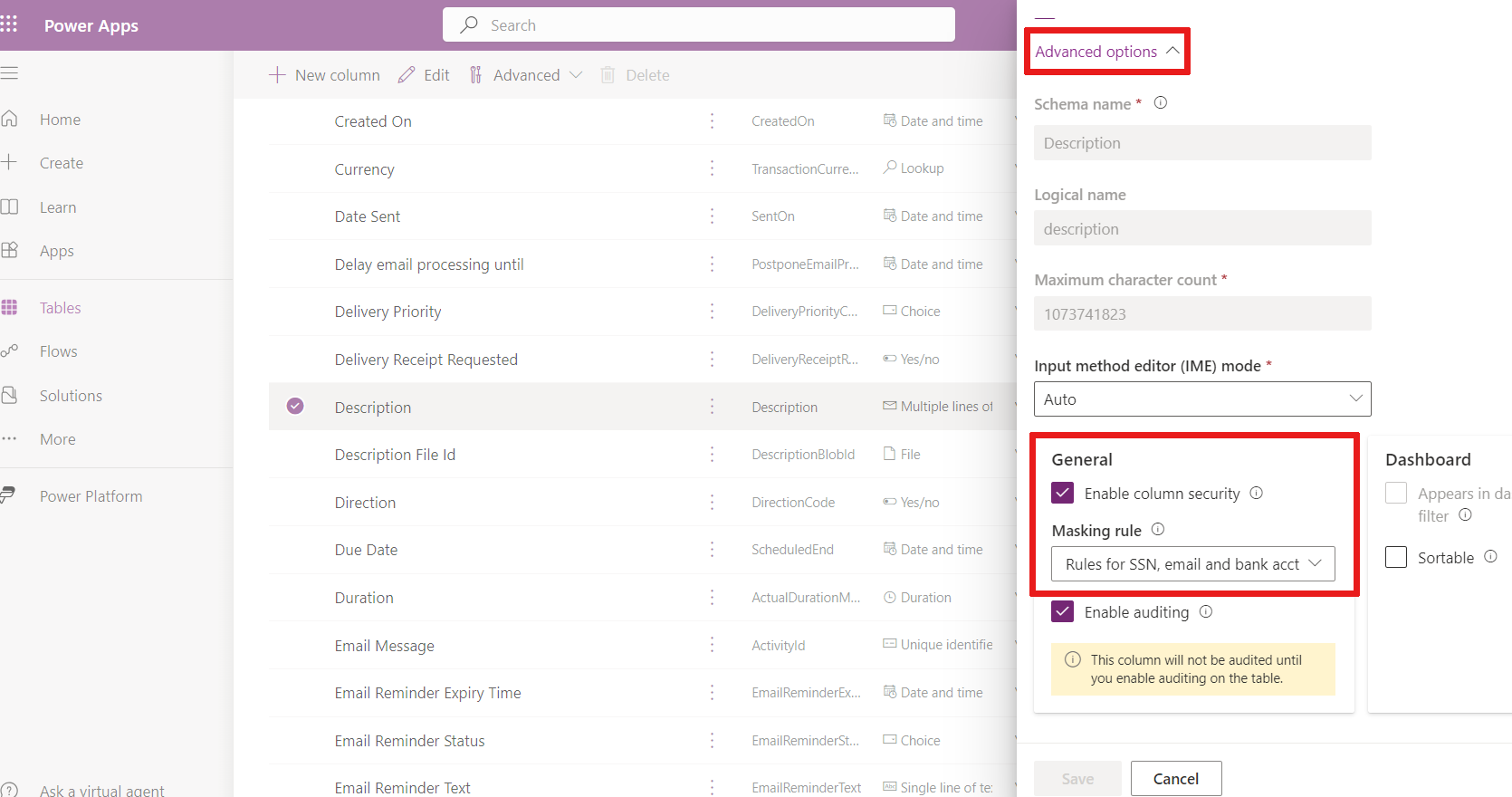 Potvrdite Omogući sigurnost stupaca ako okvir nije označen.