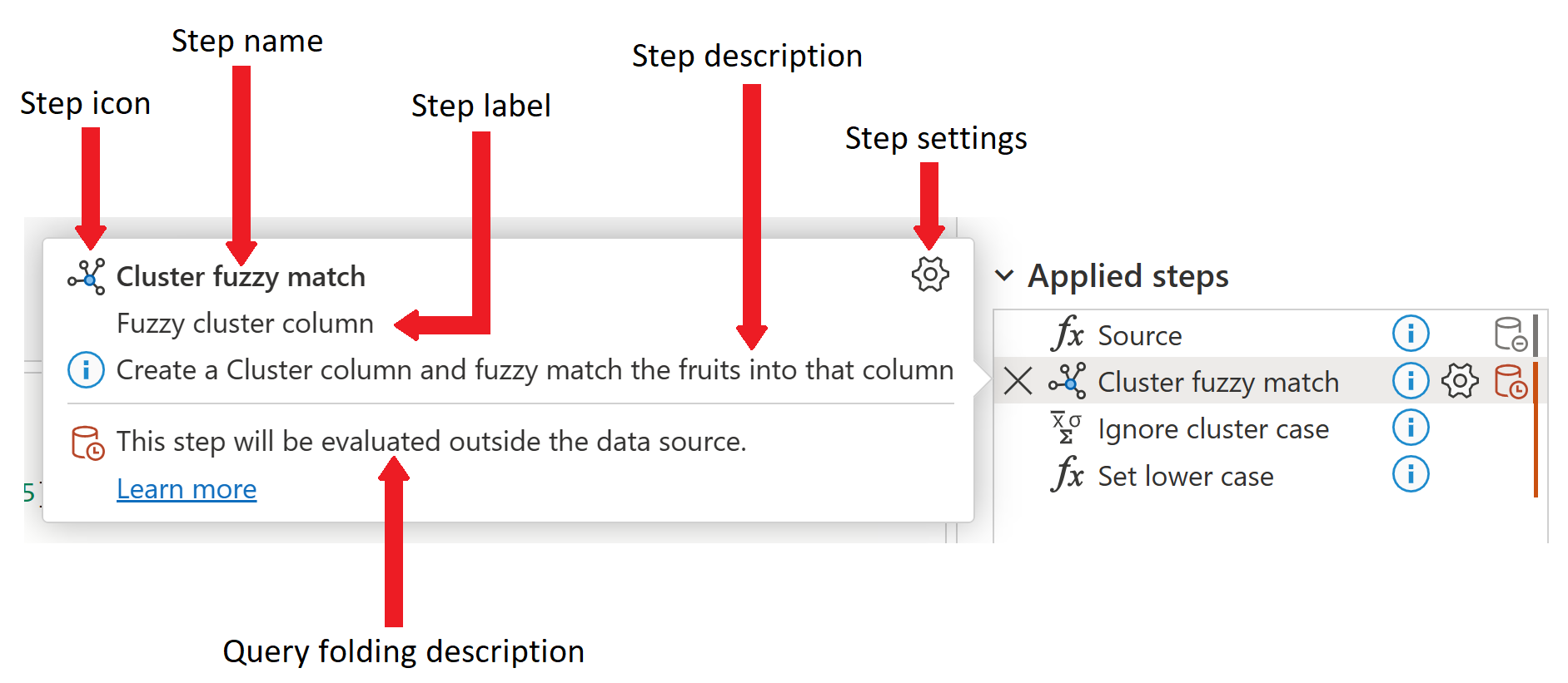 In Power Query Online, if you hover the mouse cursor over one of the applied steps, an informational display opens, listing the step name, step label, step description, step settings, information about the step query folding, and a learn more link to the Query folding indicators article. For more information about query folding, go to Overview of query evaluation and query folding in Power Query. The step label is automatically generated when the step is created, and indicates the step type, as does the step icon. The step label and the step icon can't be changed.
