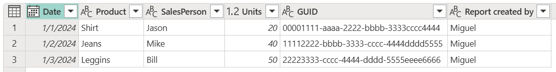After selecting OK, you create a table that only contains the Date, Product, SalesPerson, and Units columns.