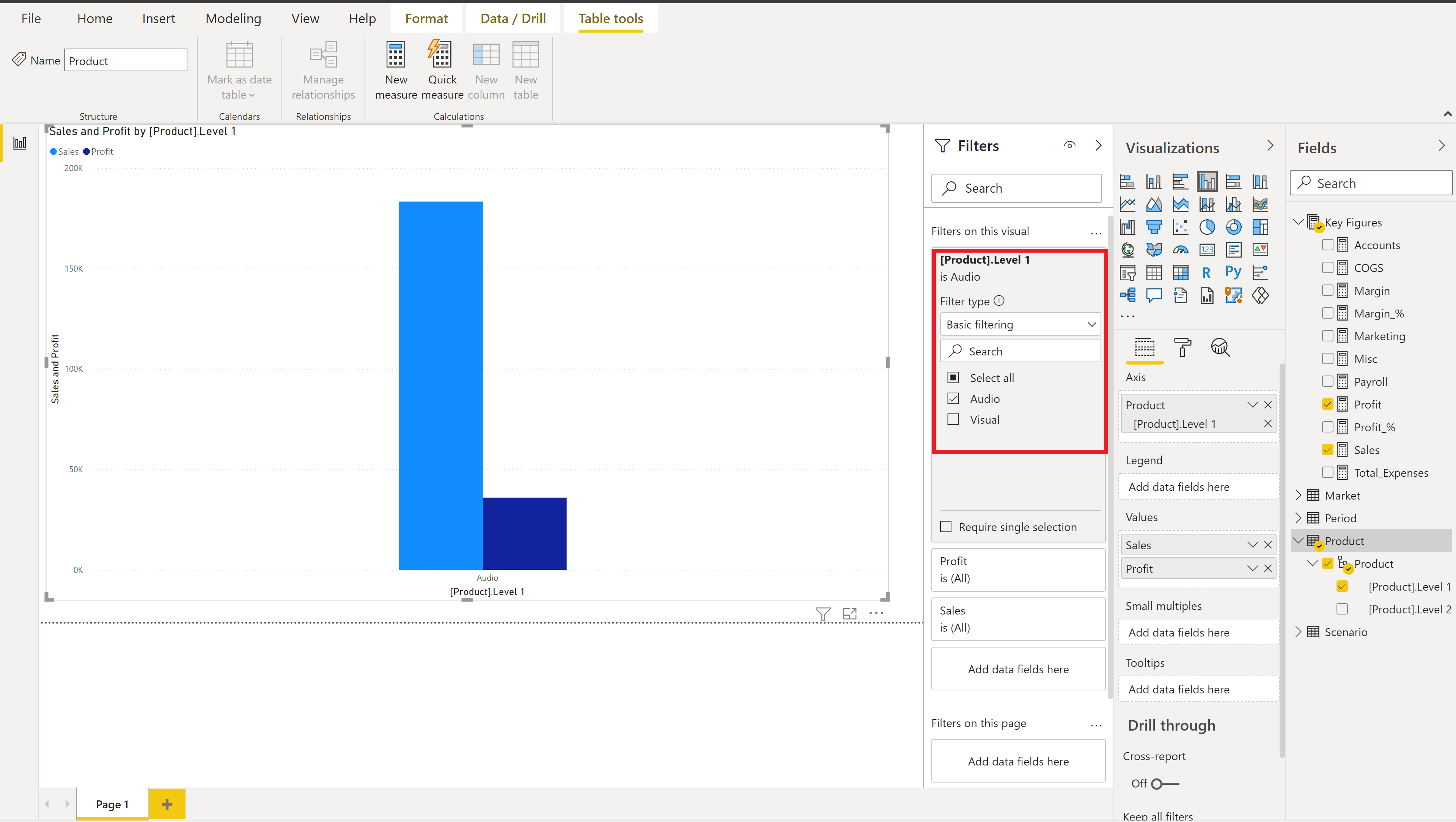 When you finish choosing the members you want in the dimension level filter, it's a good time to add that dimension level to your visualization. Check the matching dimension level in the Fields pane and it's then added to your current visualization.