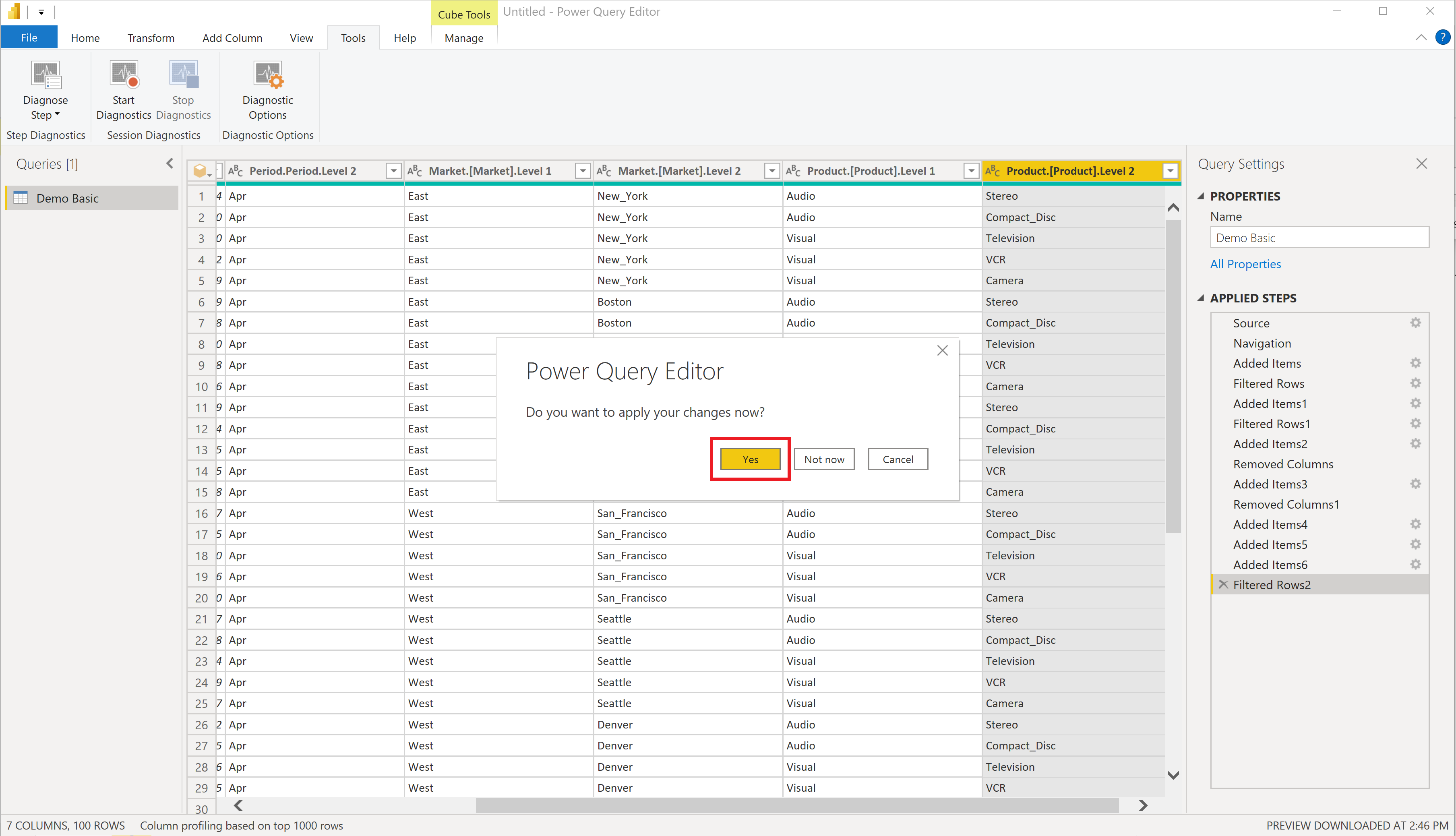 to display the list of available dimension members at this level. Select only the dimension members you need at this level and then select OK to apply the filter.The resulting data is now updated with the applied filter. Applied Steps now contains a new step (Filtered Rows) for the filter you set. You can select the settings button
