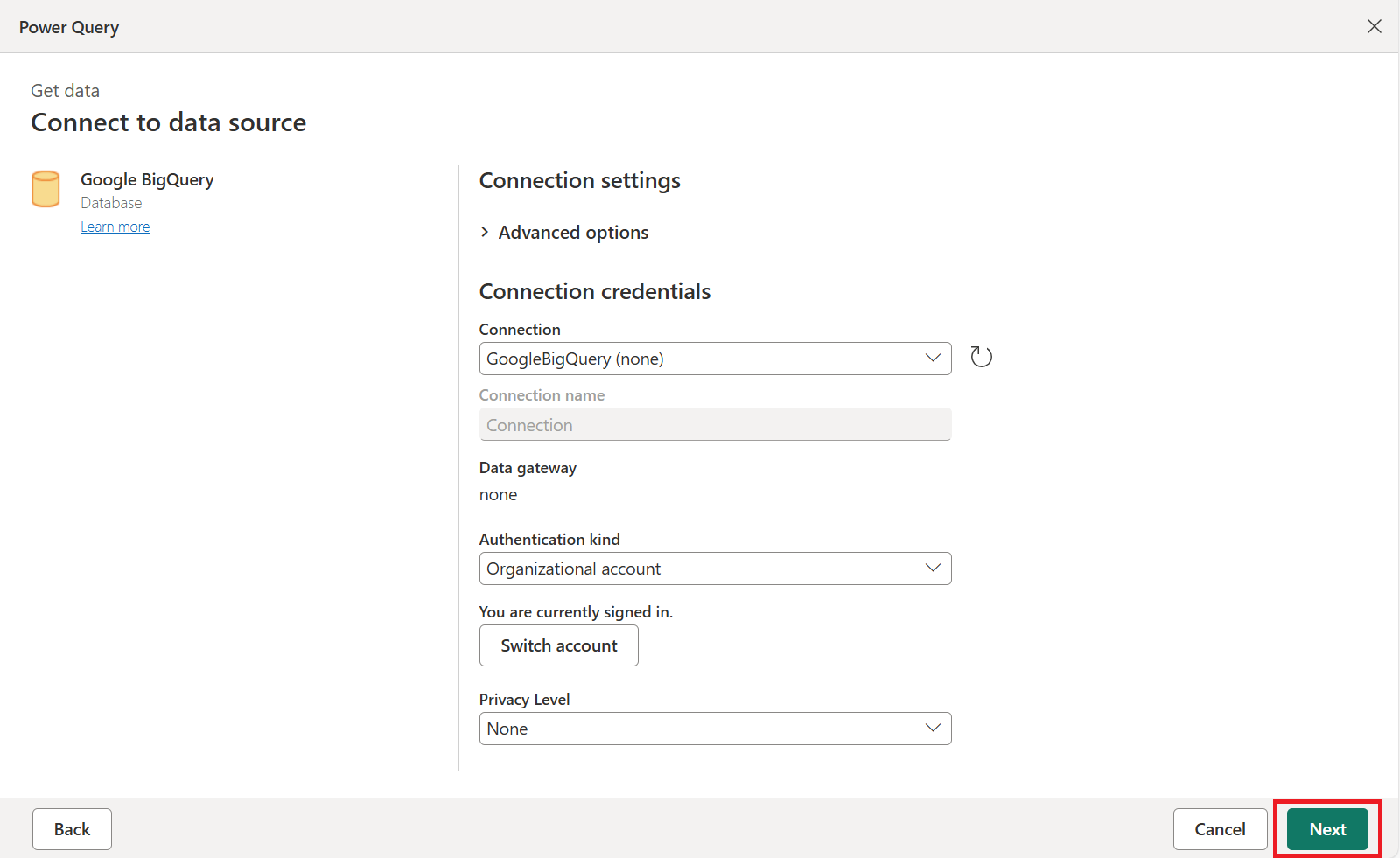 Once you select the advanced options you require, select OK in Power Query Desktop or Next in Power Query Online to connect to your Google BigQuery data.