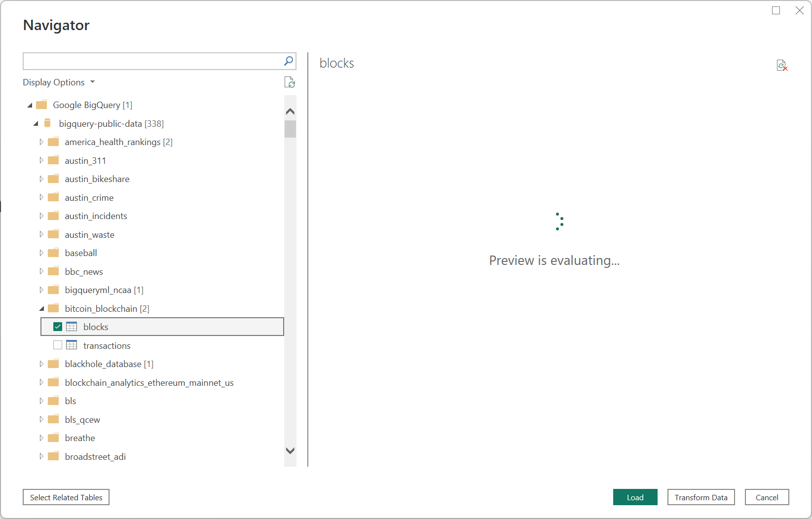 Once you successfully connect, a Navigator window appears and displays the data available on the server. Select your data in the navigator. Then select either Transform Data to transform the data in Power Query or Load to load the data in Power BI Desktop.