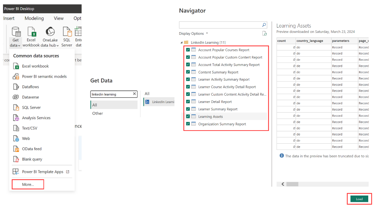 By default 1 year’s worth of data will load for each data table. Please be aware that this may take some time to load. Additionally the data tables used in the LinkedIn Learning Power BI connector match our documented API end points.