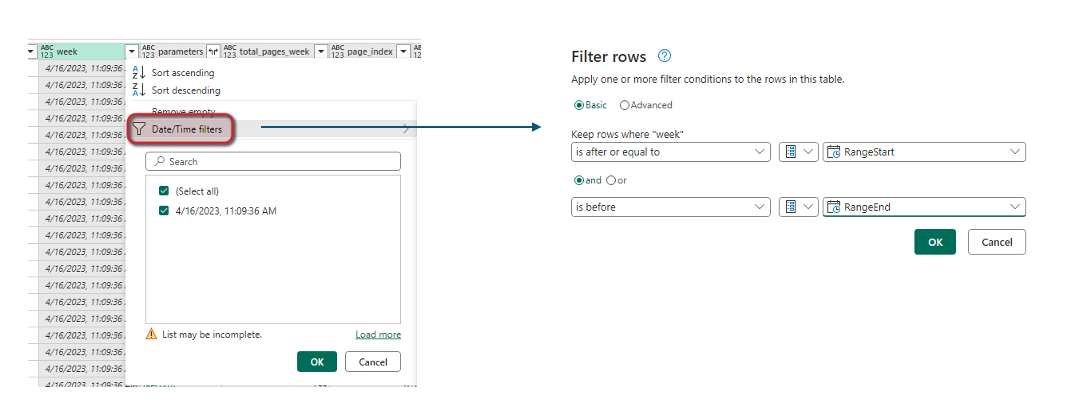 Two parameters of type datetime are needed: RangeStart and RangeEnd. > The names of parameters cannot be changed.