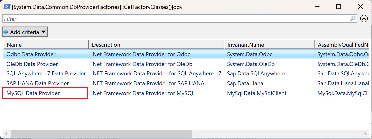 [System.Data.Common.DbProviderFactories]::GetFactoryClasses()|ogv