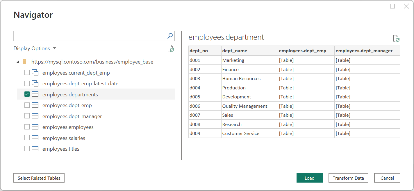 In Navigator, select the data you require, then either load or transform the data.