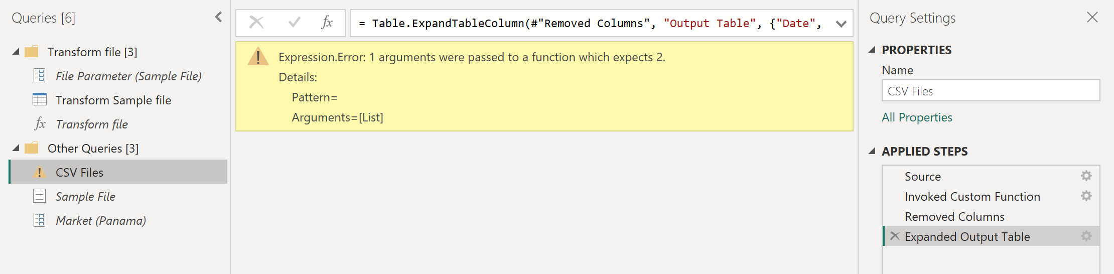 But the CSV files query has a warning sign next to it. Now that your function is updated, it requires two parameters. So the step where you invoke the function results in error values, since only one of the arguments was passed to the Transform file function during the Invoked Custom Function step.