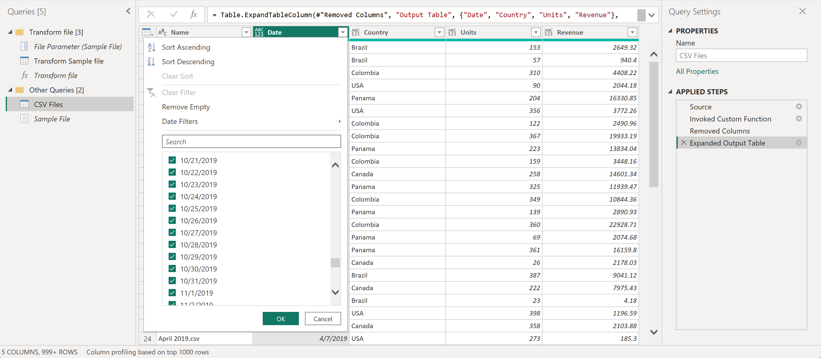 You can now return to Expanded Output Table in the Applied Steps. Check your query to validate that only rows where Country is equal to Panama show up in the final result set of the CSV Files query.