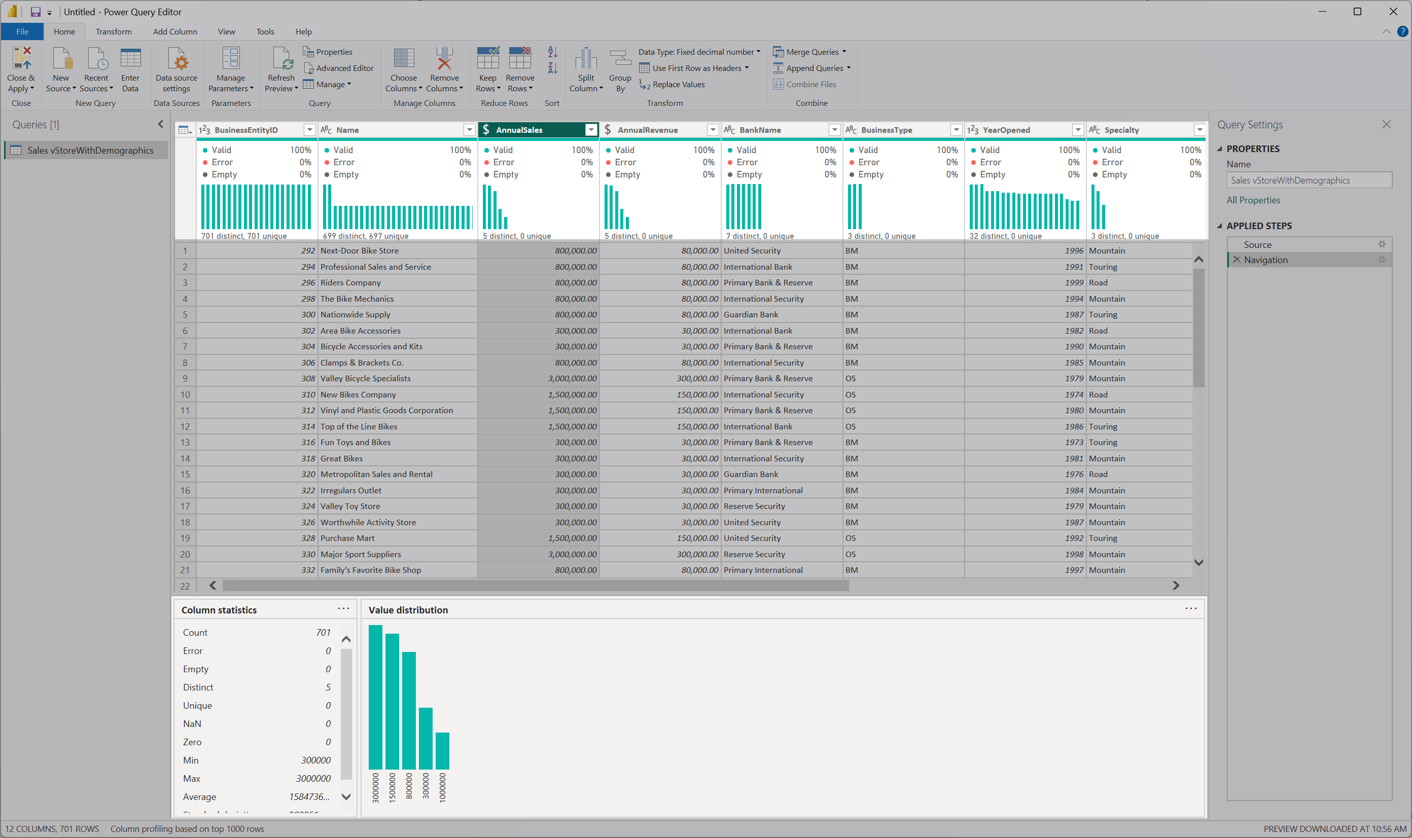 After you enable the options, the data profiling information displays in the Power Query editor.