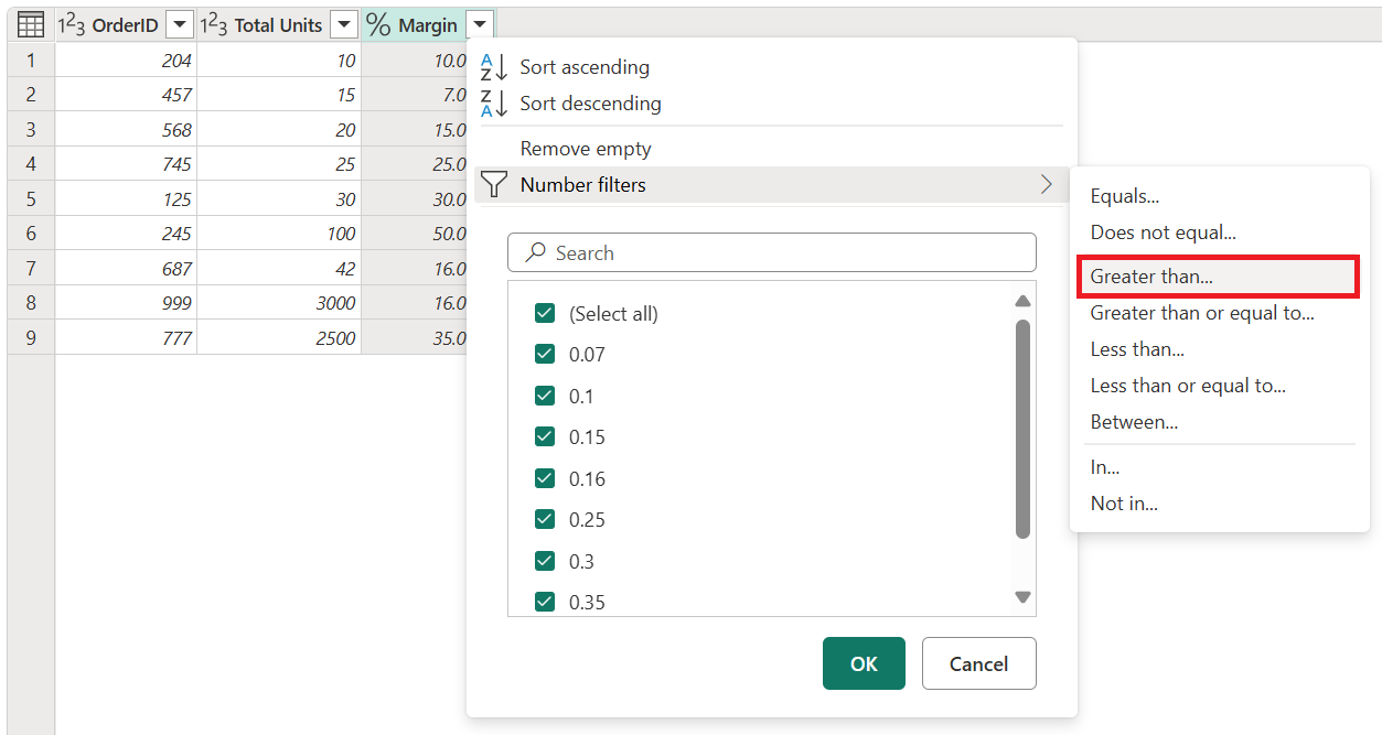 Go to the Orders query, and in the Margin field select the Greater Than filter option.
