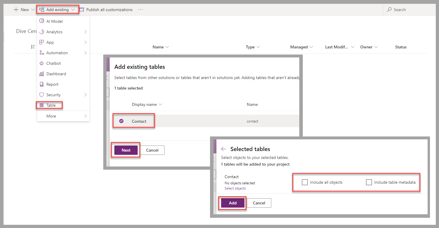 To include the list of customers in the solution, select Add existing, and then select Table to search for the Contact table. Only the table definition is required in the solution. You can leave the following checkboxes cleared: Include all objects and Include table metadata.