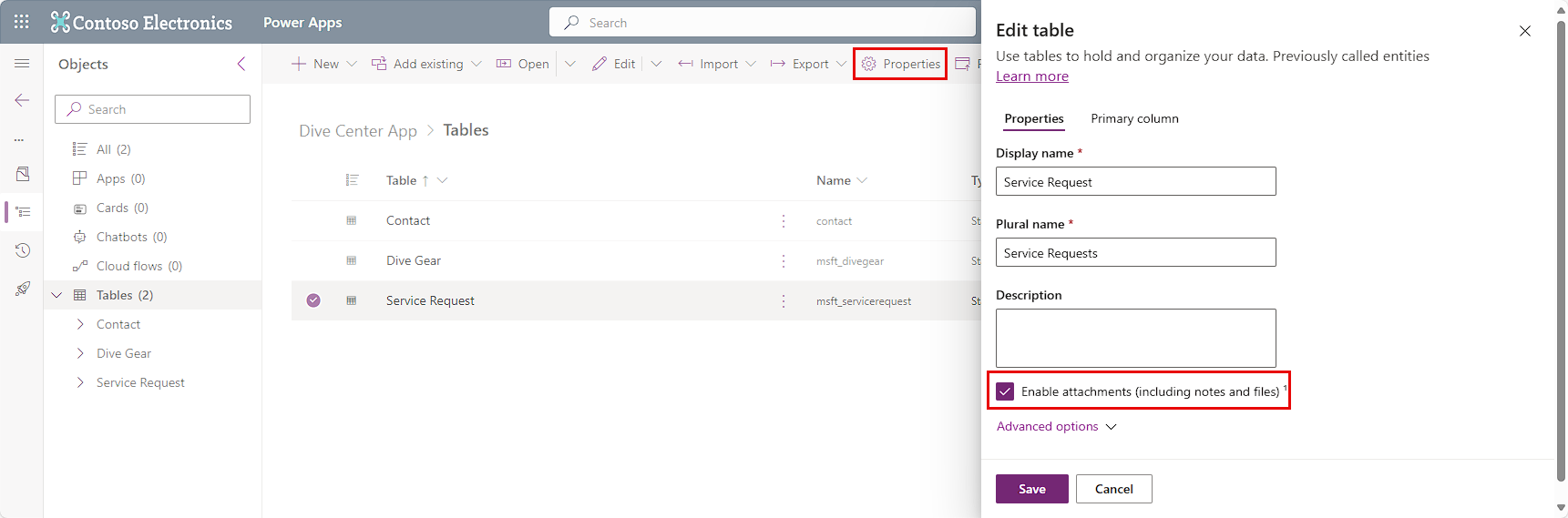 Columns: Display name Data type Required Name Single line of text Business Required Customer Lookup (Contact) Optional Details Multiple lines of text (plain text) Optional Estimated Completion Date and time Optional Gear Lookup (Dive Gear) Optional Optional: Select Enable attachments in the table properties to include pictures for the Service Request table.
