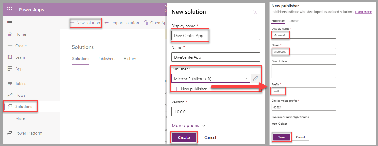 Create a new solution named Dive Center App. Select or create a new publisher named Microsoft, using the prefix msft.