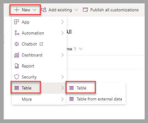 To create the Dive Gear and Service Request tables in the solution, select + New, and then select Table on the Table menu.