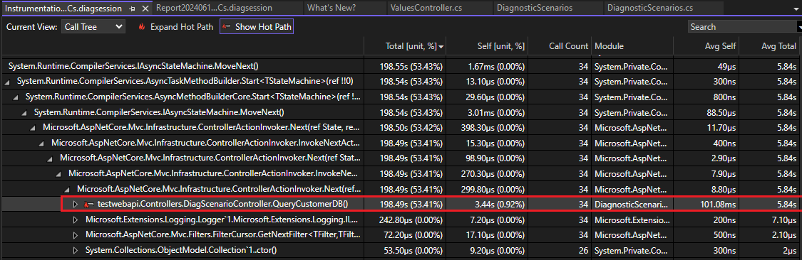 In the Call Tree view, you can see that the hot path includes the QueryCustomerDB function, which points to a potential performance issue.
