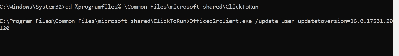 Ezután másolja és írja be a következő kódot, majd nyomja meg az Enter billentyűt:cd %programfiles% \Common Files\microsoft shared\ClickToRunOfficec2rclient.exe /update user updatetoversion=16.0.17531.20120Ez így fog kinézni. Ne feledje, hogy a folyamat hosszú időt vehet igénybe, legyen türelmes, és várja meg, amíg az Office telepítőprogramja befejeződik.