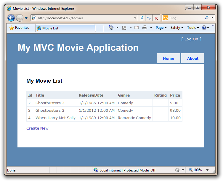 In this section we are going to implement the support necessary to enable users to create new movies in our database. We'll do this by implementing the /Movies/Create URL action.