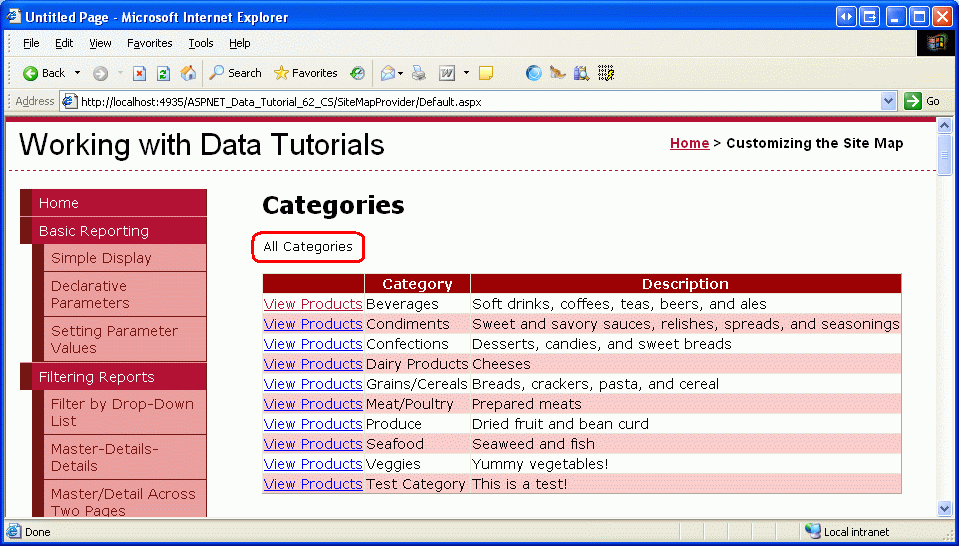 Mindenképpen tesztelje az SQL Cache függőségi funkcióját. Miután felkereste a Default.aspx, valamint ProductsByCategory.aspx és ProductDetails.aspx oldalakat, keresse meg a Szerkesztés, Beszúrás és Törlés szakasz egyik oktatóanyagát, és szerkessze egy kategória vagy termék nevét. Ezután térjen vissza a mappa egyik lapjára SiteMapProvider . Feltételezve, hogy elegendő idő telt el ahhoz, hogy a lekérdezési mechanizmus megfigyelje a mögöttes adatbázis változását, a helytérképet frissíteni kell az új termék vagy kategória nevének megjelenítéséhez.