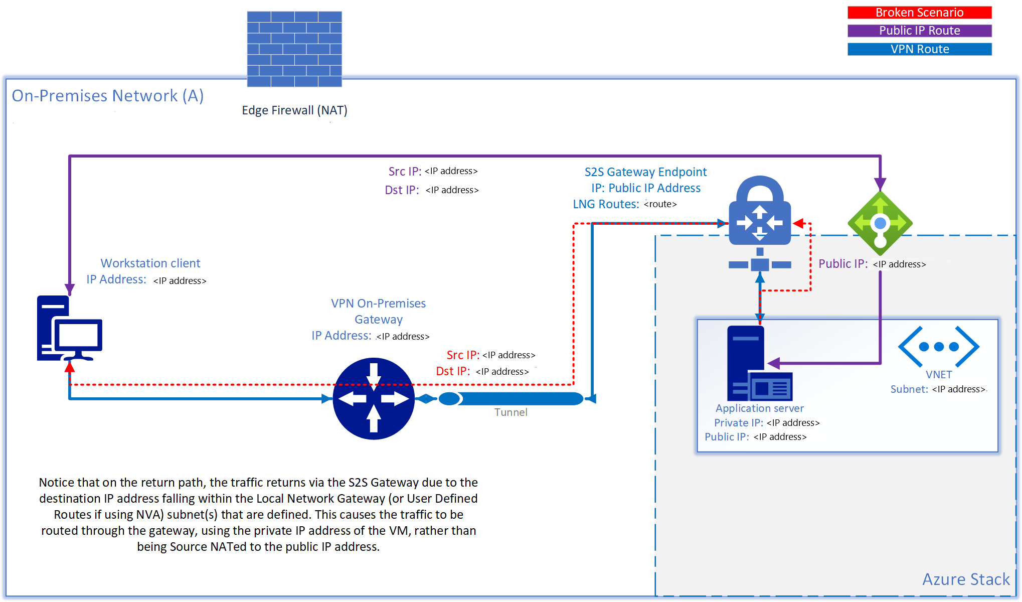 Ha egy S2S VPN-alagutat használnak erőforrások helyszíni hálózatokhoz vagy onnan való csatlakoztatásához, előfordulhat, hogy egy erőforráshoz nyilvános IP-cím is hozzárendelve van, és az már nem érhető el ezen a nyilvános IP-címen keresztül. Ha a forrás megpróbálja elérni a nyilvános IP-címet, ugyanabban az alhálózati tartományban található, amely a helyi hálózati átjáró útvonalaiban (virtuális hálózati átjáró) vagy az NVA-megoldások felhasználó által megadott útvonalán van meghatározva, az Azure Stack Hub a konfigurált útválasztási szabályok alapján megpróbálja visszairányíteni a kimenő forgalmat a forráshoz az S2S-alagúton keresztül. A visszatérési forgalom a virtuális gép magánhálózati IP-címét használja ahelyett, hogy a forrást nyilvános IP-címként kellene megadni: