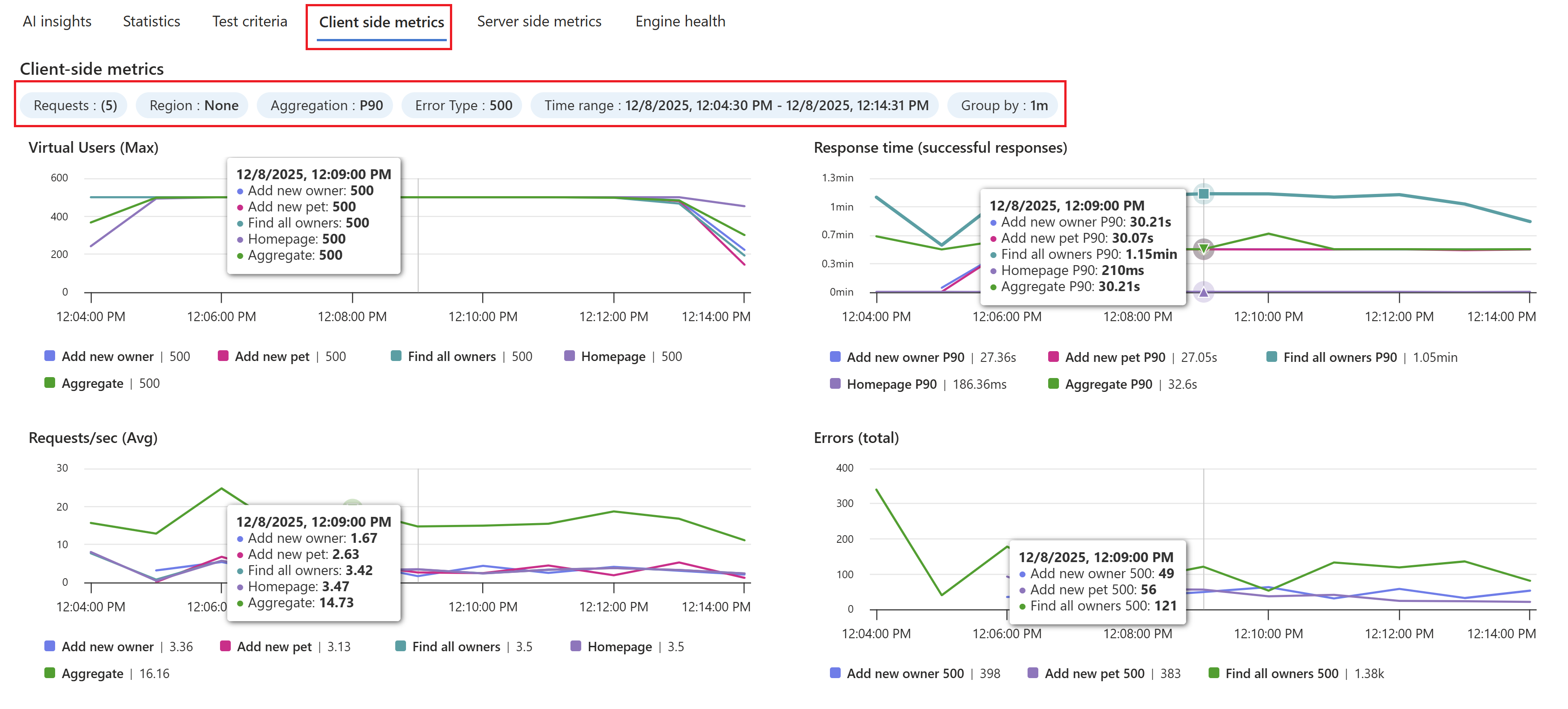 Az ügyféloldali metrikák egy-egy mintavevő vagy kérés szintjén, valamint összesített szinten érhetők el. A szűrőkkel szükség szerint szeletelheti és kockázhatja a metrikákat, és következtetéseket vonhat le a terhelésteszt során megfigyelt teljesítményről. Egy adott kérés 500 hibáját például a Kérések és a Hibatípus szűrőkkel tekintheti meg. Hasonlóképpen megtekintheti a maximális választ egy adott régióban a Régió és az Aggregációs szűrők használatával.